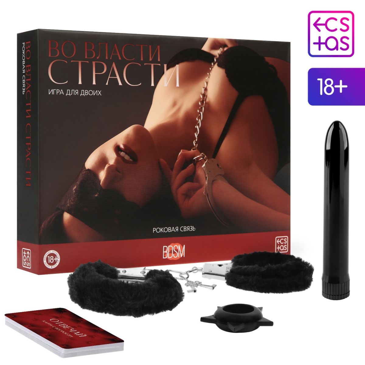 Игра для двоих «Во власти страсти. Роковая связь», 5 в 1 (50 карт, наручники, эрекционное кольцо, вибратор, 2 листа со сценариями), 18+