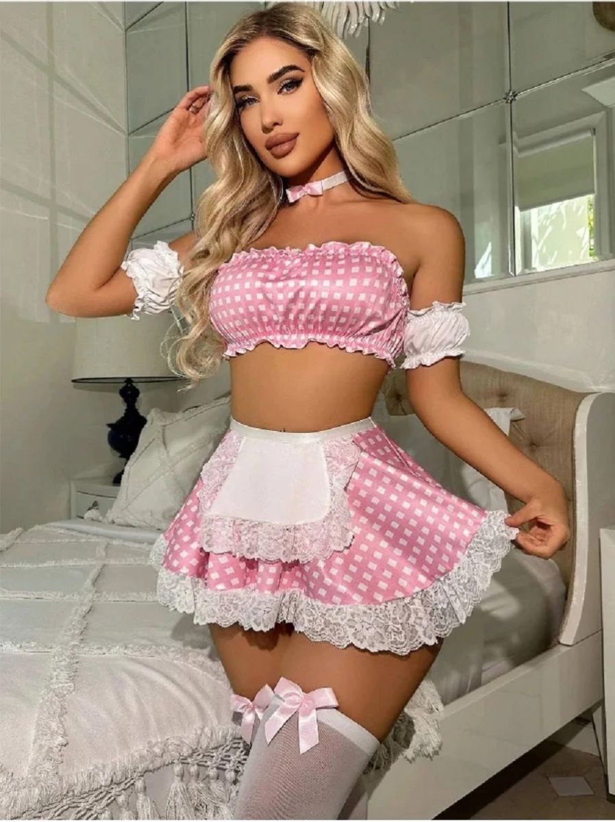 Какой мужчина не мечтает о девушке в сексуальном костюмчике очаровательной служанки? Этот костюм воплотит в жизнь Ваши эротические фантазии. Эротический костюм включает в себя коплект из топа в виде лифа с оборками, юбку с небольшим передничком украшенные клетчатым розовым рисунком, манжеты с оборками на плечи, трусики стринги, воротничек чокер с бантиком и белые чулки.